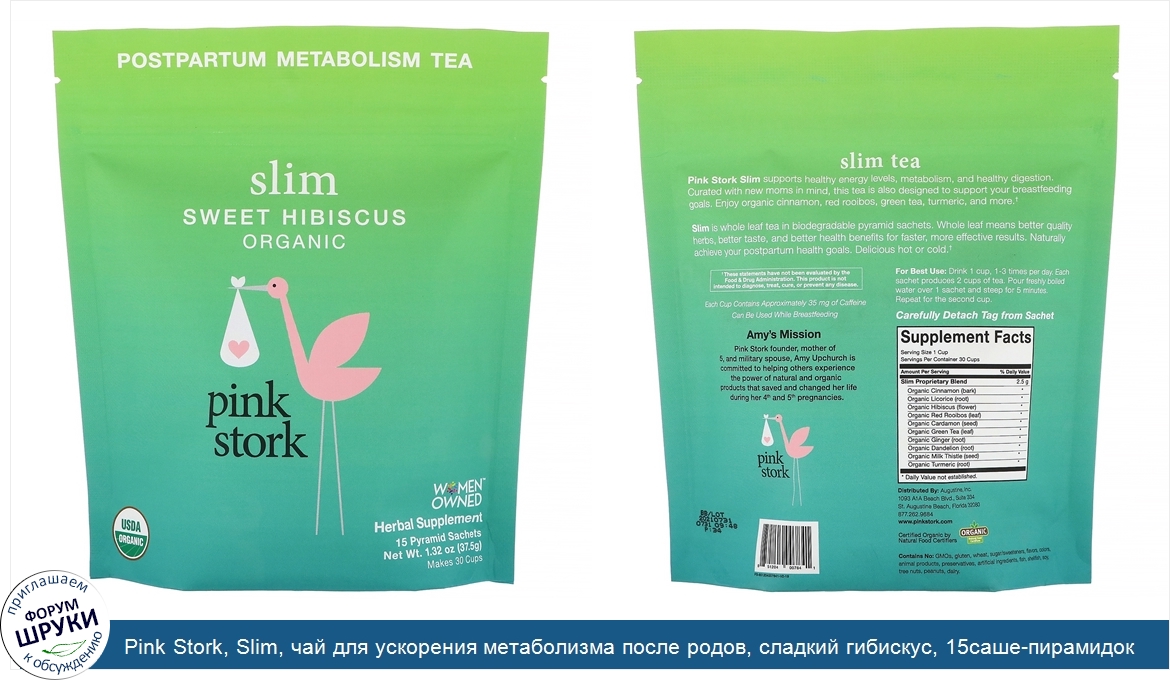 Pink Stork, Slim, чай для ускорения метаболизма после родов, сладкий гибискус, 15саше-пирамидок, 37,5г (1,32унции)