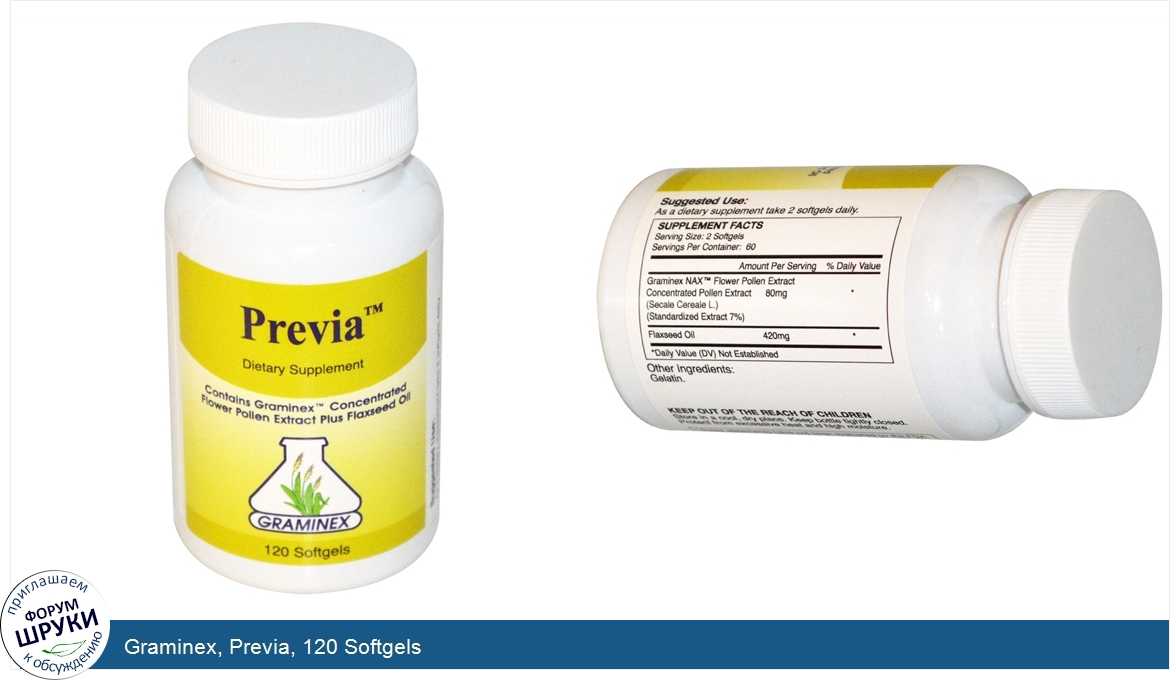 [DESCRIPT]Dietary Supplement. Contains Graminex Concentrated Flower Pollen Extract Plus Flaxseed Oil. What is Previa? . Formulated using Graminex's proprietary formula of NAX Flower Pollen Extract, Previa offers the unique benefits of lipid soluble nutrients found in flower pollen extract including, phytosterols, enzymes and antioxidants in combination with Flax seed oil. The phytosterols found in Previa are both naturally occurring and naturally concentrated. These nutrients have been shown to have benefits for heart health and supporting women's specific health needs.[/DESCRIPT]... (описание дополняется)