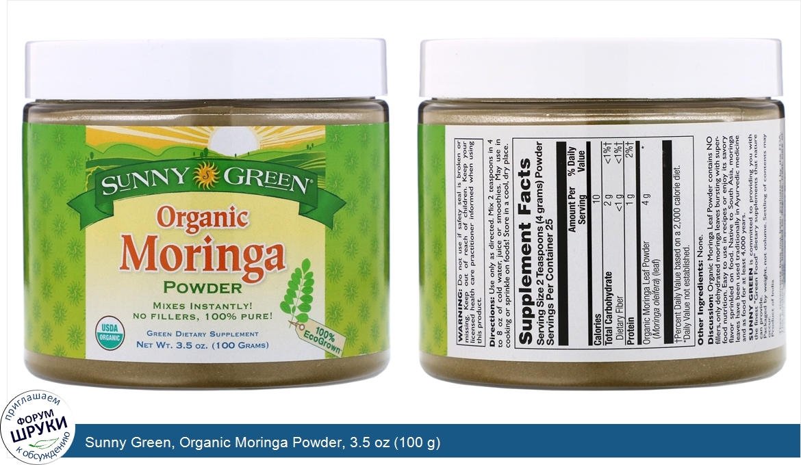Друзья, если у вас есть отзыв/дополнение/комментарий/вопрос относительно Sunny Green, Organic Moringa Powder, 3.5 oz (100 g) - напишите его ответом в эту тему (это будет полезно всему сообществу в целом и вам в отдельности).