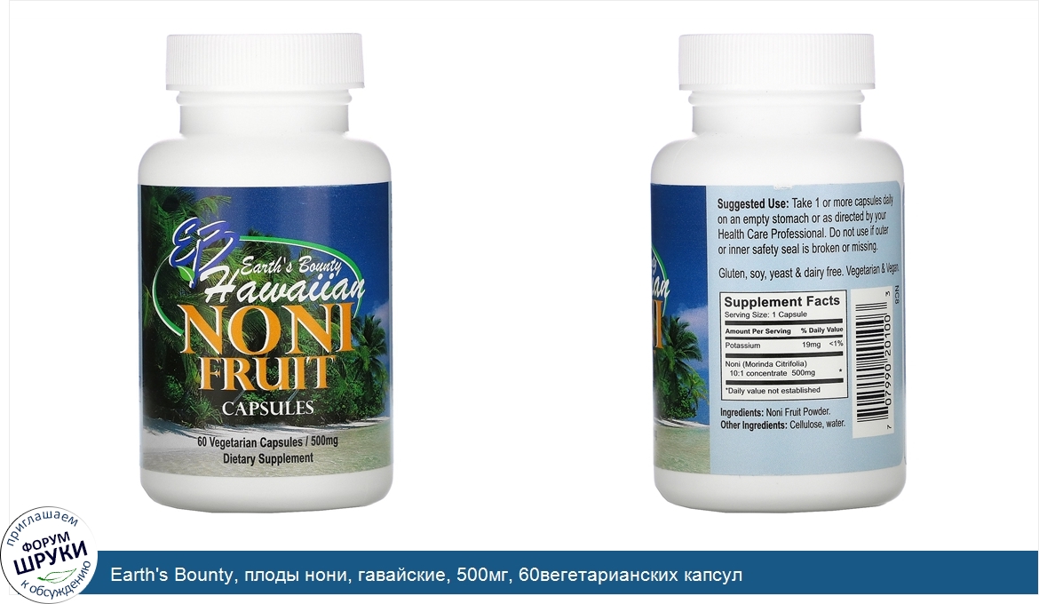 Earth's Bounty, плоды нони, гавайские, 500мг, 60вегетарианских капсул