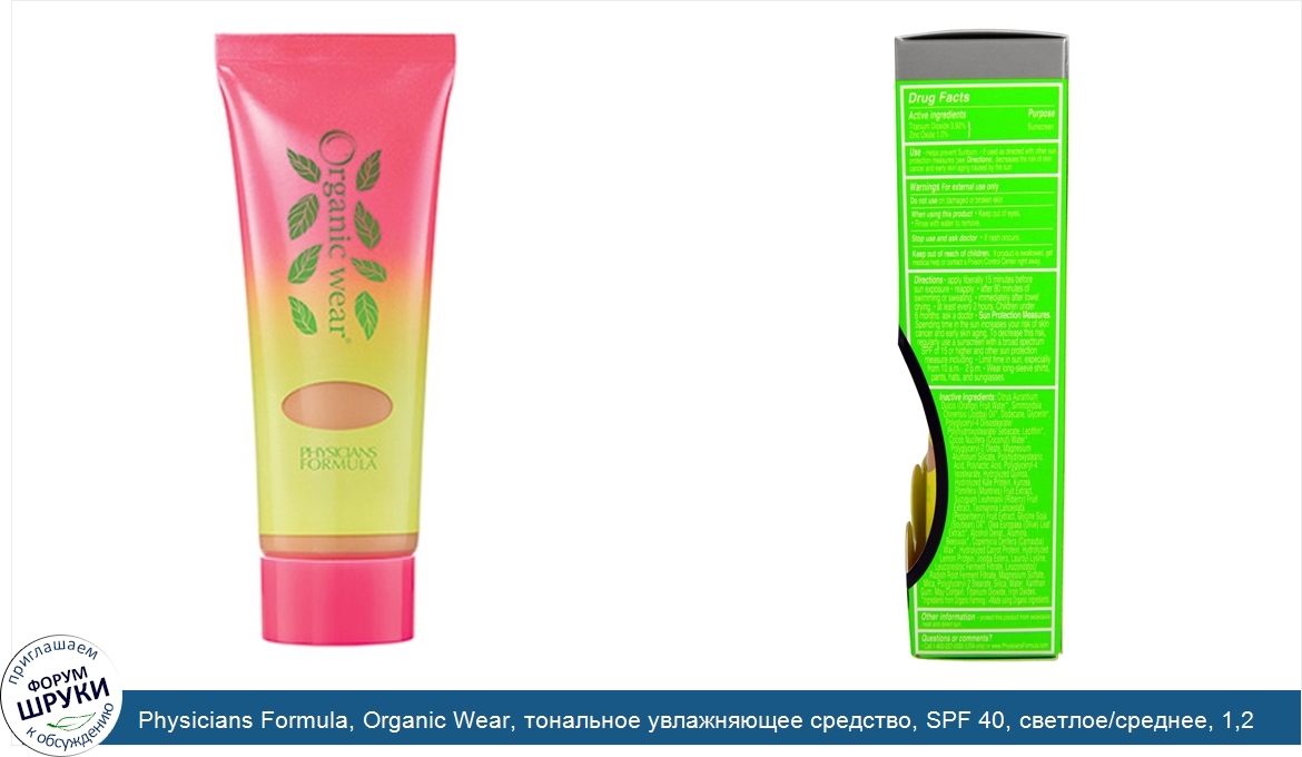Physicians Formula, Organic Wear, тональное увлажняющее средство, SPF 40, светлое/среднее, 1,2 жидких унций (35 мл)