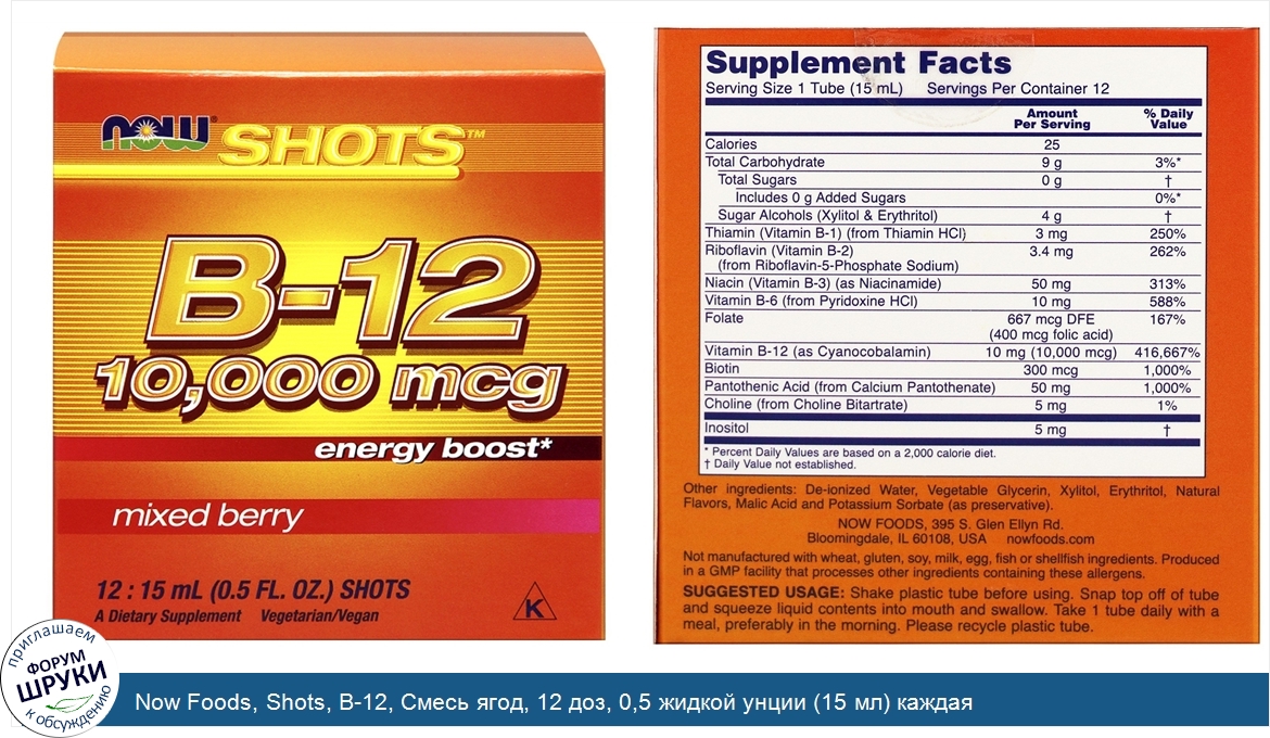 Друзья, если у вас есть отзыв/дополнение/комментарий/вопрос относительно Now Foods, Shots, B-12, Смесь ягод, 12 доз, 0,5 жидкой унции (15 мл) каждая - напишите его ответом в эту тему (это будет полезно всему сообществу в целом и вам в отдельности).