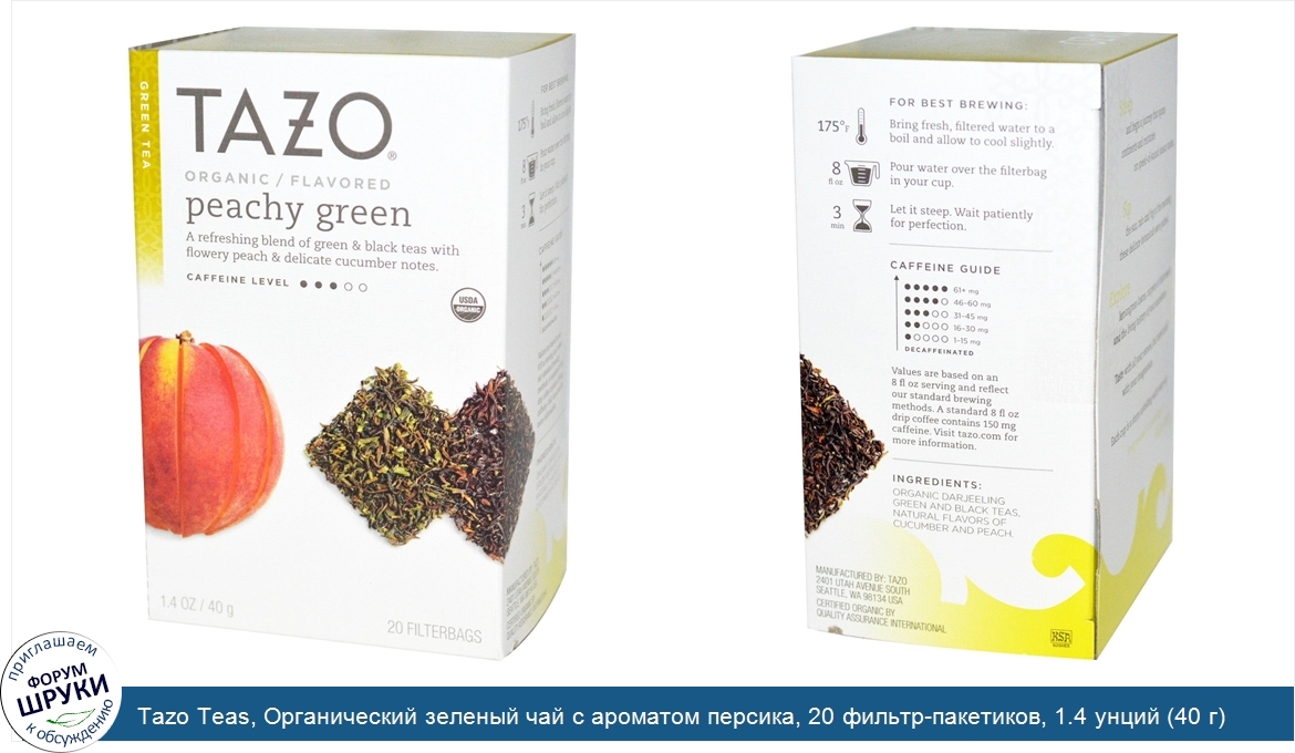 Друзья, если у вас есть отзыв/дополнение/комментарий/вопрос относительно Tazo Teas, Органический зеленый чай с ароматом персика, 20 фильтр-пакетиков, 1.4 унций (40 г) - напишите его ответом в эту тему (это будет полезно всему сообществу в целом и вам в отдельности).