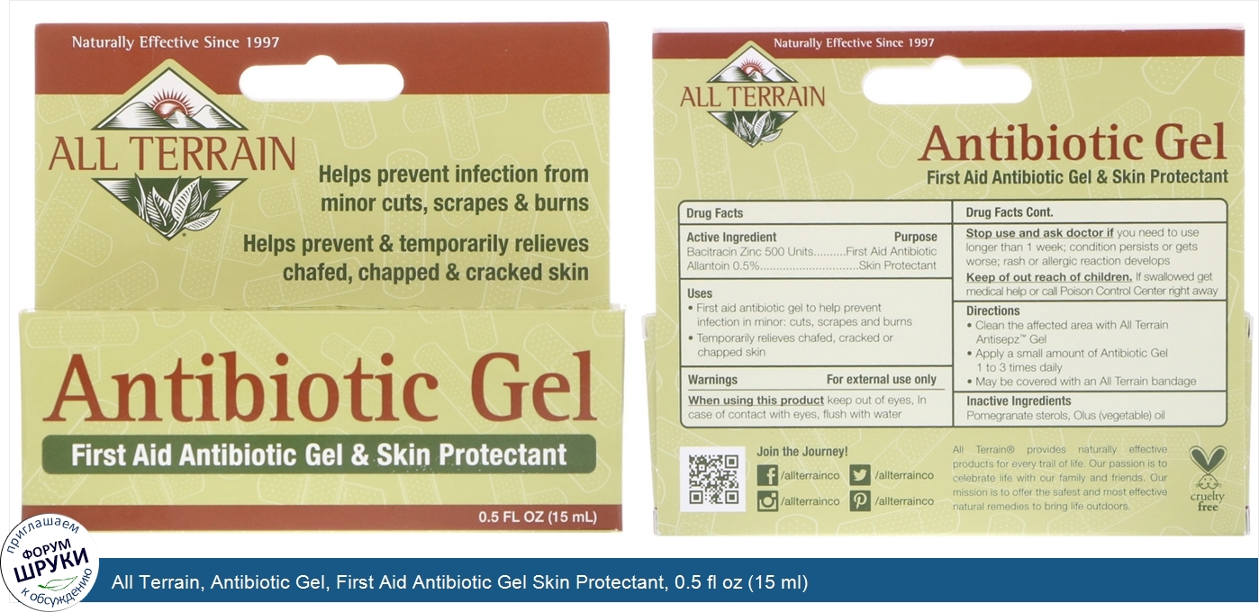 [DESCRIPT]Naturally Effective Since 1997. Cruelty Free. All Terrain provides naturally effective products for every trail of life. Our passion is to celebrate life with our family and friends. Our mission is to offer the safest and most effective natural remedies to bring life outdoors. Uses. First aid antibiotic gel to help prevent infection in minor: cuts, scrapes and burns. Temporarily relieves chafed, cracked or chapped skin . For external use only.[/DESCRIPT]... (описание дополняется)