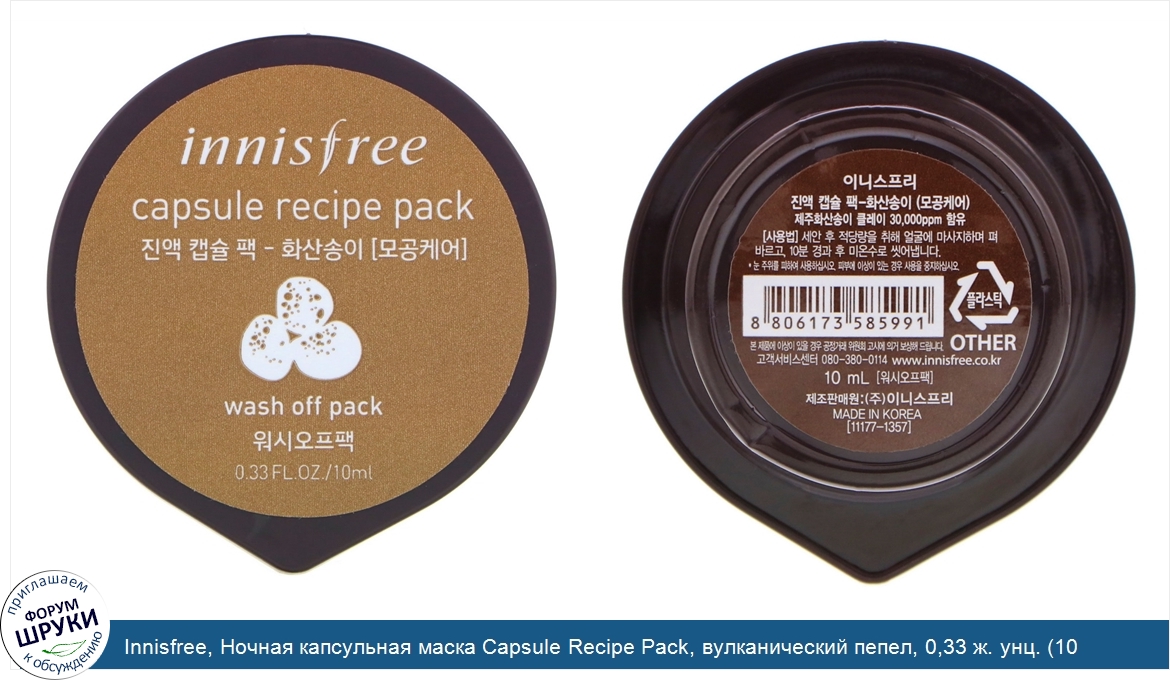 Друзья, если у вас есть отзыв/дополнение/комментарий/вопрос относительно Innisfree, Ночная капсульная маска Capsule Recipe Pack, вулканический пепел, 0,33 ж. унц. (10 мл) - напишите его ответом в эту тему (это будет полезно всему сообществу в целом и вам в отдельности).
