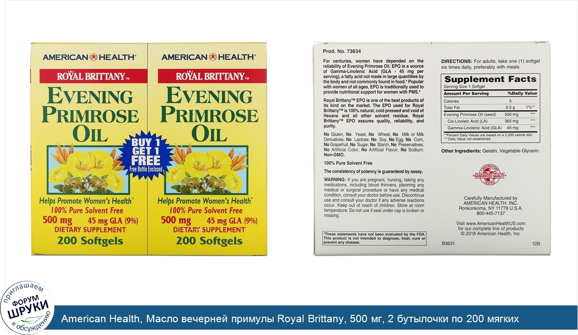 Друзья, если у вас есть отзыв/дополнение/комментарий/вопрос относительно American Health, Масло вечерней примулы Royal Brittany, 500 мг, 2 бутылочки по 200 мягких капсул - напишите его ответом в эту тему (это будет полезно всему сообществу в целом и вам в отдельности).