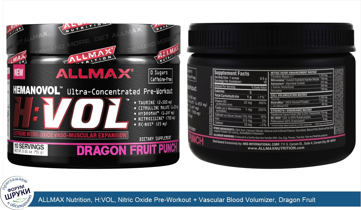 Друзья, если у вас есть отзыв/дополнение/комментарий/вопрос относительно ALLMAX Nutrition, H:VOL, Nitric Oxide Pre-Workout + Vascular Blood Volumizer, Dragon Fruit Punch, 3.35 oz (95 g) - напишите его ответом в эту тему (это будет полезно всему сообществу в целом и вам в отдельности).