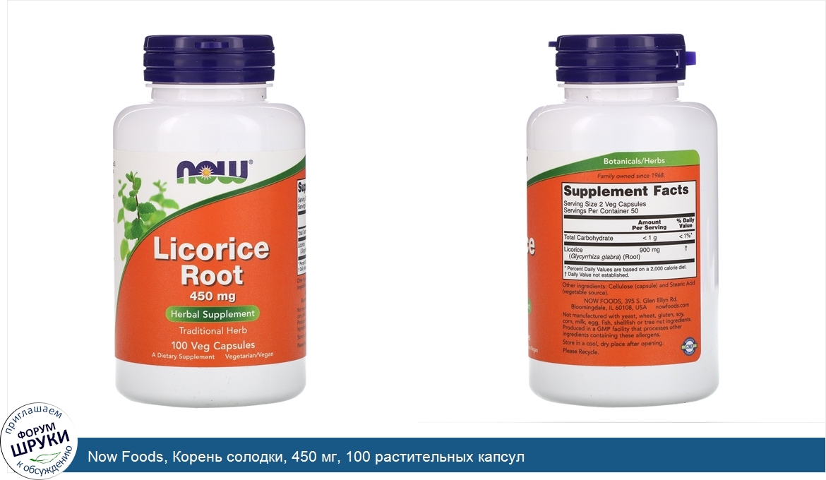 Now Foods, Корень солодки, 450 мг, 100 растительных капсул