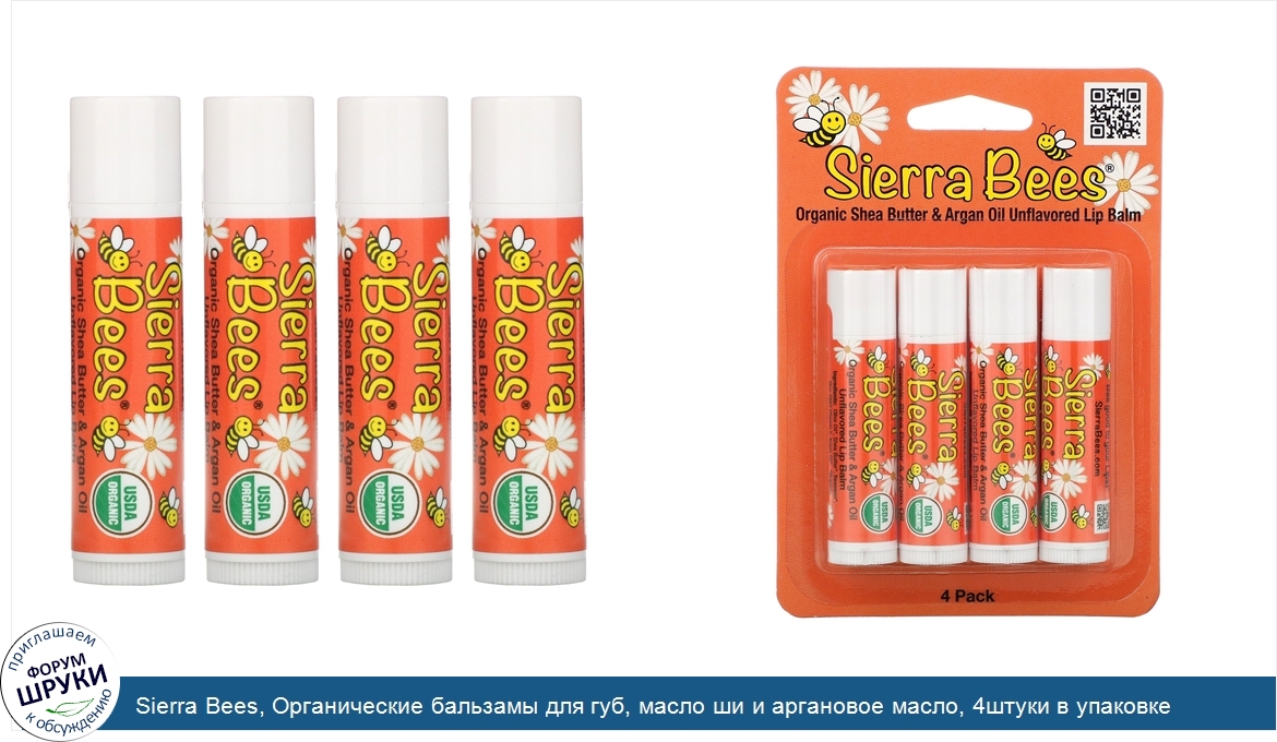 Sierra Bees, Органические бальзамы для губ, масло ши и аргановое масло, 4штуки в упаковке весом 0,15унции (4,25г) каждая