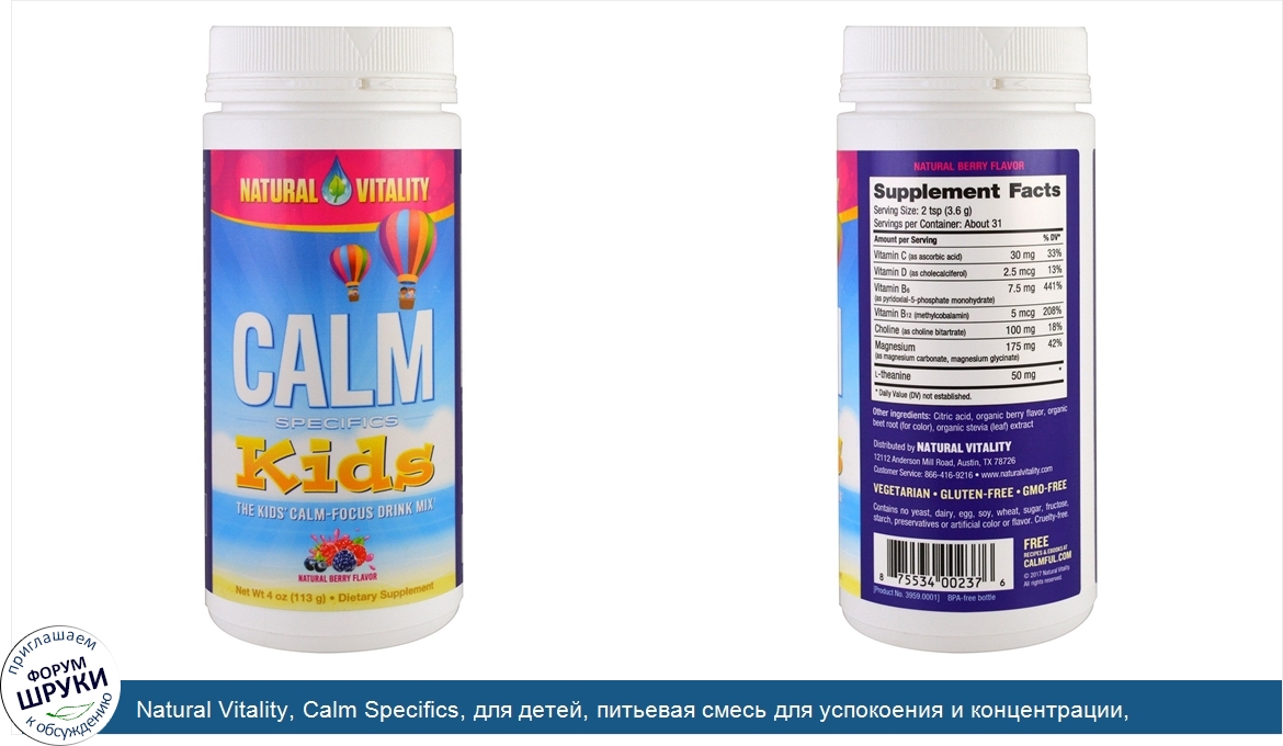 Друзья, если у вас есть отзыв/дополнение/комментарий/вопрос относительно Natural Vitality, Calm Specifics, для детей, питьевая смесь для успокоения и концентрации, натуральные ягоды, 4 унции (113 г) - напишите его ответом в эту тему (это будет полезно всему сообществу в целом и вам в отдельности).