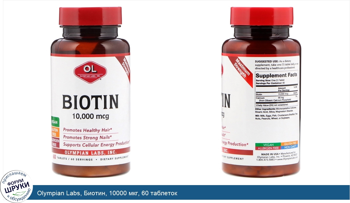 Друзья, если у вас есть отзыв/дополнение/комментарий/вопрос относительно Olympian Labs, Биотин, 10000 мкг, 60 таблеток - напишите его ответом в эту тему (это будет полезно всему сообществу в целом и вам в отдельности).