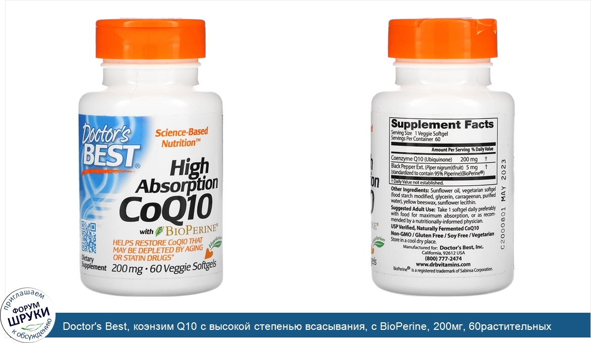 Science-Based Nutrition™. Пищевая добавка. Подходит для вегетарианцев. Без ГМО, глютена и сои. Коэнзим Q10 с высокой степенью всасываемости от Doctor's Best содержит чистый коэнзим Q10 (убихинон) и BioPerine®. Ко...
