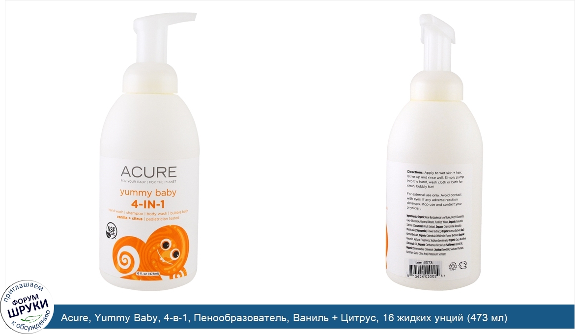 Друзья, если у вас есть отзыв/дополнение/комментарий/вопрос относительно Acure, Yummy Baby, 4-в-1, Пенообразователь, Ваниль + Цитрус, 16 жидких унций (473 мл) - напишите его ответом в эту тему (это будет полезно всему сообществу в целом и вам в отдельности).