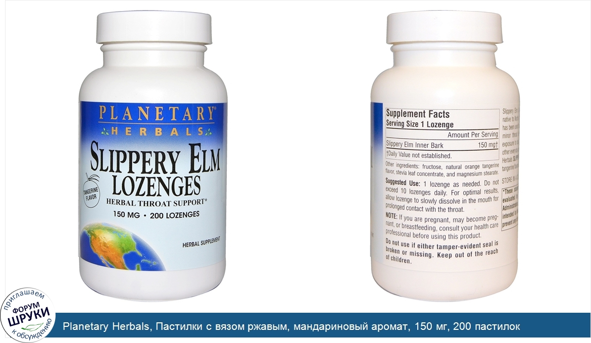 [DESCRIPT]Herbal Throat Support. Herbal Supplement. Slippery Elm (Ulmus Rubra) is a tree native to North America. The inner bark has been used for generations to soothe minor throat irritation associated with exposure to dust, excessive talking and other everyday activities. These Planetary Herbals Slippery Elm Lozenges are tangerine flavored for great taste.[/DESCRIPT]... (описание дополняется)