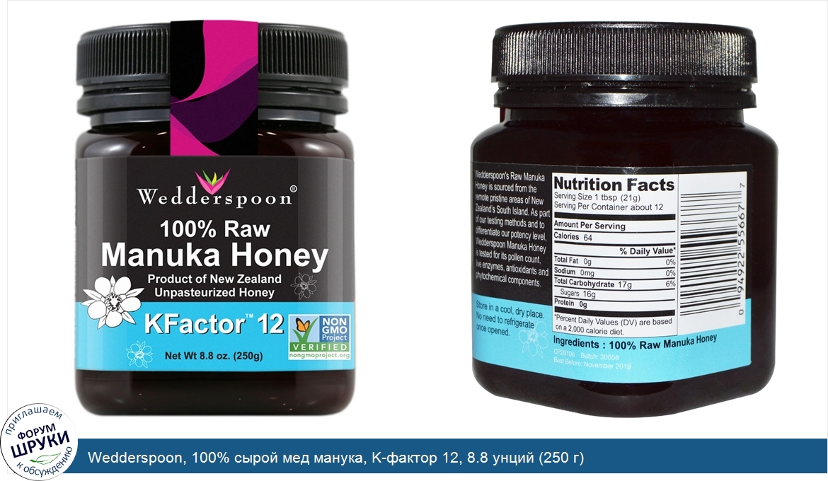 Друзья, если у вас есть отзыв/дополнение/комментарий/вопрос относительно Wedderspoon, 100% сырой мед манука, K-фактор 12, 8.8 унций (250 г) - напишите его ответом в эту тему (это будет полезно всему сообществу в целом и вам в отдельности).