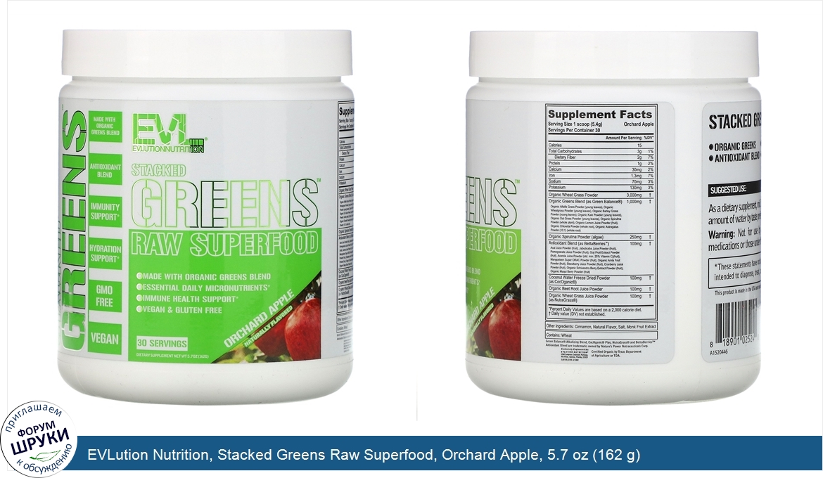 Друзья, если у вас есть отзыв/дополнение/комментарий/вопрос относительно EVLution Nutrition, Stacked Greens Raw Superfood, Orchard Apple, 5.7 oz (162 g) - напишите его ответом в эту тему (это будет полезно всему сообществу в целом и вам в отдельности).