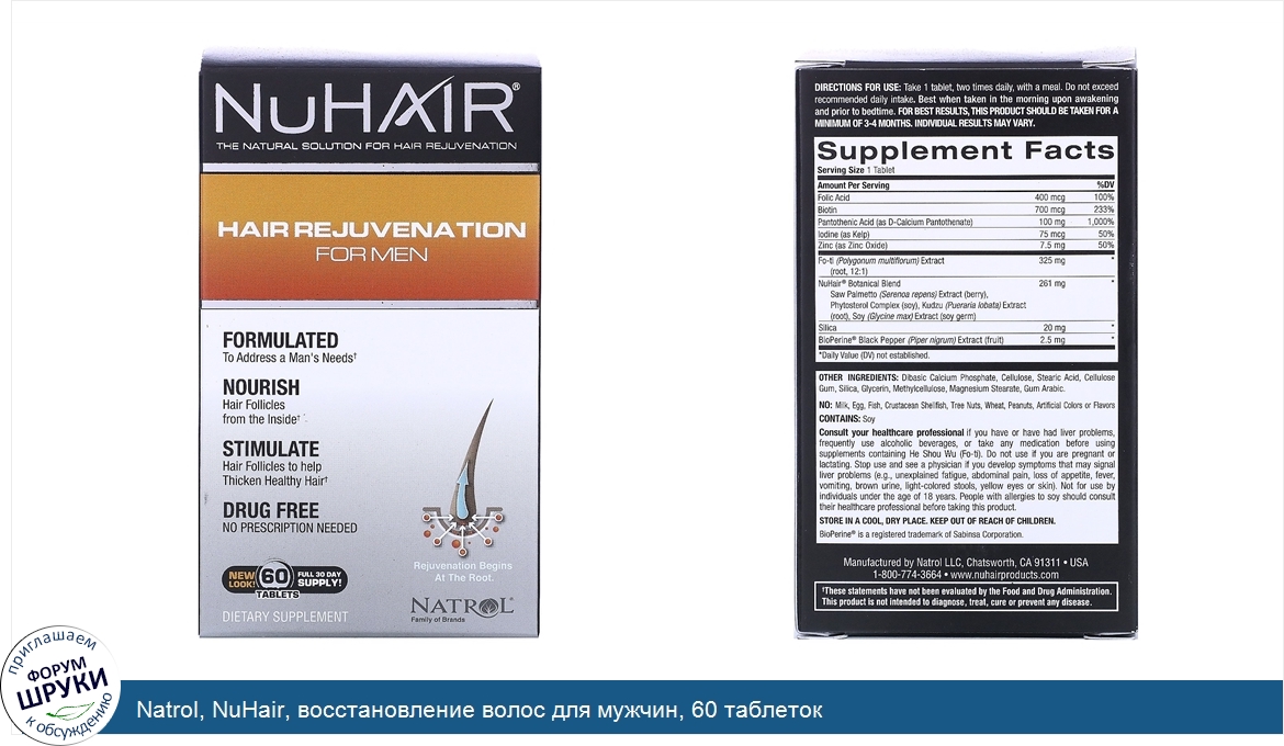 [DESCRIPT]The Natural Solution for Hair Rejuvenation. Formulated to Address a Man’s Needs. Nourish Hair Follicles from the Inside. Stimulate Hair Follicles to Help Thicken Healthy Hair. Drug Free - No Prescription Needed. Full 30 Day Supply! Dietary Supplement. Rejuvenation Begins at the Root. Natrol Family of Brands. Hair Rejuvenation for Men Works Naturally:. Loaded with natural ingredients that help to restore the appearance of thicker, healthier hair. Folic Acid. - Aids in the production of red blood cells. Iodine (from Kelp). - Boosts hair health growth through its effects on thyroid function. Zinc (as Zinc Oxide). - Promotes healthy hair scalp. Helps with cell reproduction, hormonal balance, absorption of vitamins protein synthesis. Phytosterol Complex Saw Palmetto Extract. - Powerful natural extracts that support healthy hormonal balance. He Shou Wu (Fo-ti). - Traditionally used to support hair regrowth may help prevent thinning graying hair. Biotin. - B vitamin, traditionally used to promote thicker, fuller healthy looking hair. Pantothenic Acid (as D-Calcium Pantothenate). - Vitamin B5 supports healthy hair. Hair Rejuvenation for Men Works from the Inside Out. NuHair for Men is specifically formulated for men with natural ingredients men need to help nourish and stimulate the hair shaft. This combination of vitamins, minerals and herbs helps restore the appearance of healthier hair.[/DESCRIPT]... (описание дополняется)