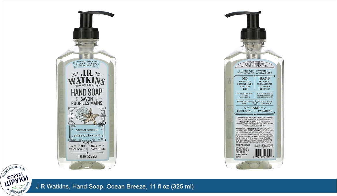 Друзья, если у вас есть отзыв/дополнение/комментарий/вопрос относительно J R Watkins, Hand Soap, Ocean Breeze, 11 fl oz (325 ml) - напишите его ответом в эту тему (это будет полезно всему сообществу в целом и вам в отдельности).