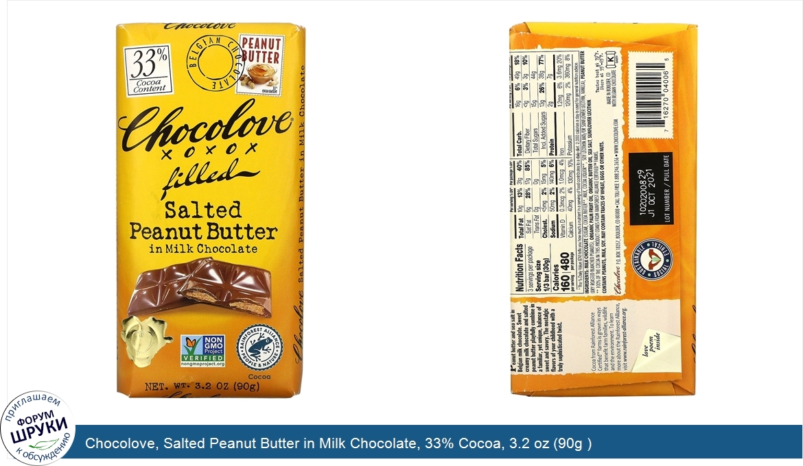 Chocolove, Salted Peanut Butter in Milk Chocolate, 33% Cocoa, 3.2 oz (90g )