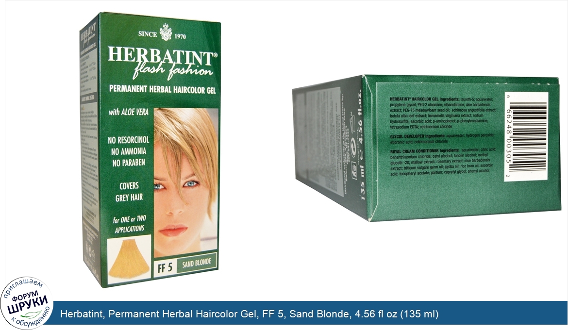 Друзья, если у вас есть отзыв/дополнение/комментарий/вопрос относительно Herbatint, Permanent Herbal Haircolor Gel, FF 5, Sand Blonde, 4.56 fl oz (135 ml) - напишите его ответом в эту тему (это будет полезно всему сообществу в целом и вам в отдельности).