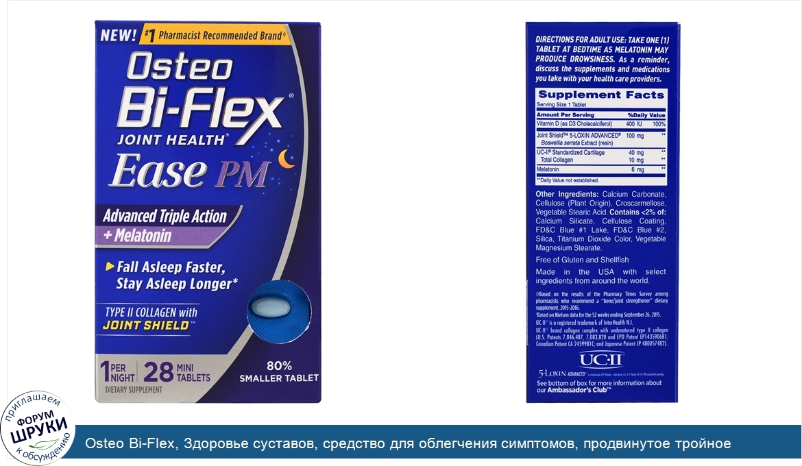 Рекомендованный фармацевтами бренд #1♦. Быстро засыпайте, спите дольше. Коллаген типа II с защитой суставов. 1 в ночь. Пищевая добавка. Таблетки на 80% меньше. Osteo Bi-Flex Ease PM поддерживает суставы и крепкий...