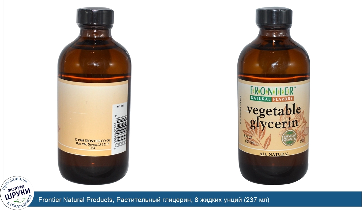 Друзья, если у вас есть отзыв/дополнение/комментарий/вопрос относительно Frontier Natural Products, Растительный глицерин, 8 жидких унций (237 мл) - напишите его ответом в эту тему (это будет полезно всему сообществу в целом и вам в отдельности).
