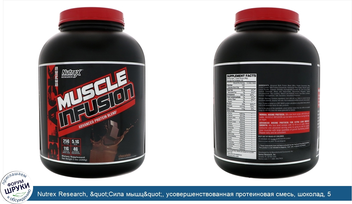 [DESCRIPT]Серия Black. Nutrex Research. Прогрессивная протеиновая смесь. 25 г белка. 5,1 г аминокислот с разветвленной цепью. 11 г незаменимых аминокислот. 4 г прекурсоров глутамина. Пищевая добавка. Натуральные и искусственные ароматизаторы. Характеристики продуктов Muscle Infusion. 25 грамм белка в порции. 5 разных белков. Снабжение организма концентратами и изолятами сывороточного белка. Высокое содержание незаменимых аминокислот. Богатый натуральными аминокислотами с разветвленной цепью (BCAA) продукт. Низкое содержание жира. Подготовленный для быстрого приготовления продукт: легко перемешивается ложкой. Потрясающий вкус. Muscle Infusion - это продвинутая формула с разнообразными протеинами, которая снабжает организм 25 граммами высококачественного белка на порцию. Muscle Infusion содержит пять различных белков, а не концентрируется на каком-то одном источнике. Muscle Infusion содержит большое количество незаменимых аминокислот, которые являются настоящими "кирпичиками" для роста мышц. Это отличный источник глутамина, а высокое содержание аминокислот с разветвленной цепью натурального происхождения делает этот продукт отличным средством ускорения роста и восстановления мышц. Muscle Infusion отличается очень низким содержанием жира, поддерживая вашу потребность в наращивании сухой мышечной массы. Продукт имеет очень приятный вкус и отлично растворяется с помощью обычной ложки.[/DESCRIPT]... (описание дополняется)