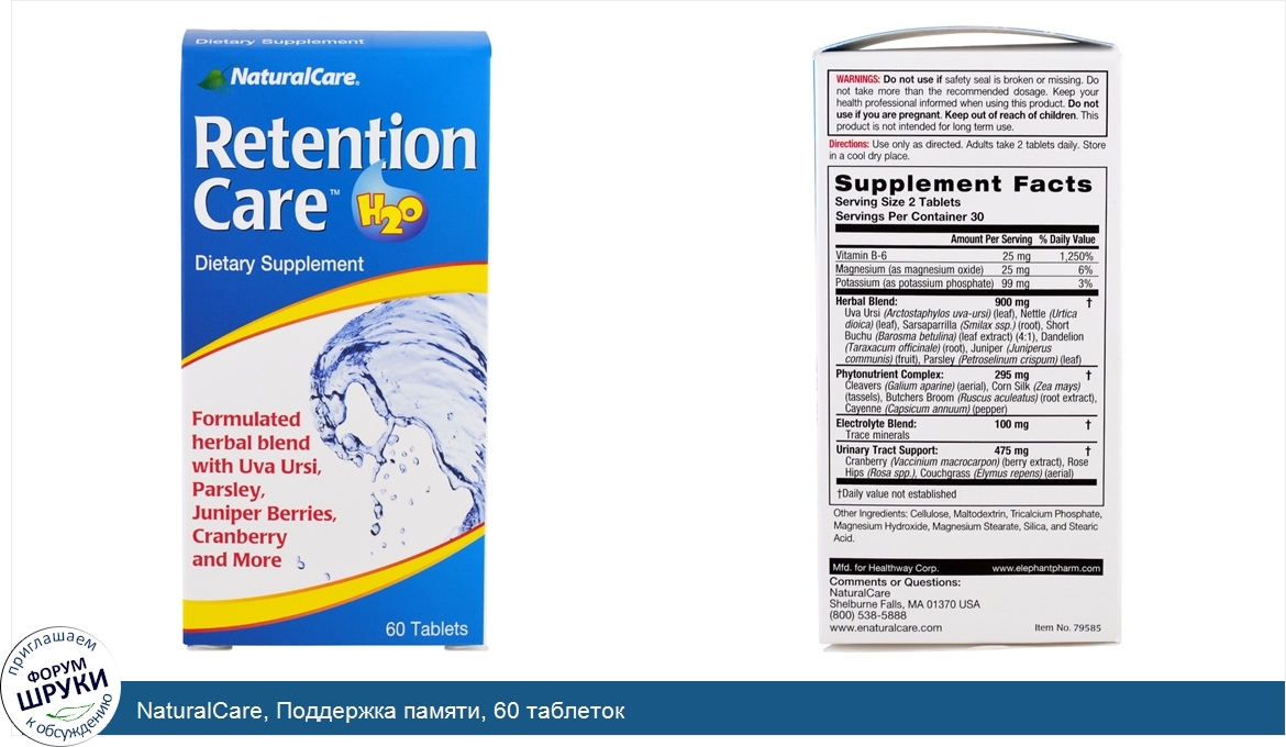 H2O. Dietary Supplement. Formulated herbal blend with Uva Ursi, Parsley, Juniper Berries, Cranberry and More. Herbal Blend. Retention Care uses a balanced blend of botanicals that are known for their reputed gent...