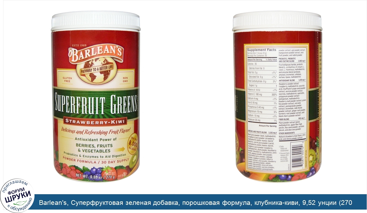 Друзья, если у вас есть отзыв/дополнение/комментарий/вопрос относительно Barlean's, Суперфруктовая зеленая добавка, порошковая формула, клубника-киви, 9,52 унции (270 г) - напишите его ответом в эту тему (это будет полезно всему сообществу в целом и вам в отдельности).