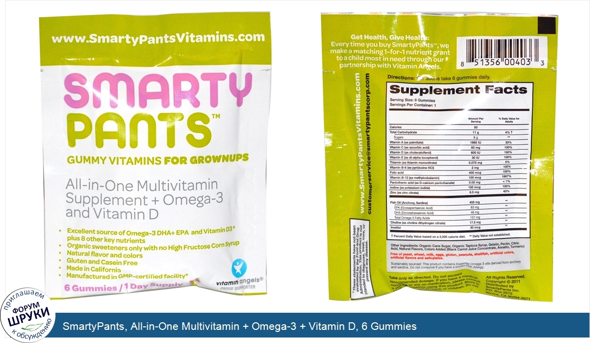 ru SmartyPants, All-in-One Multivitamin + Omega-3 + Vitamin D, 6 Gummies