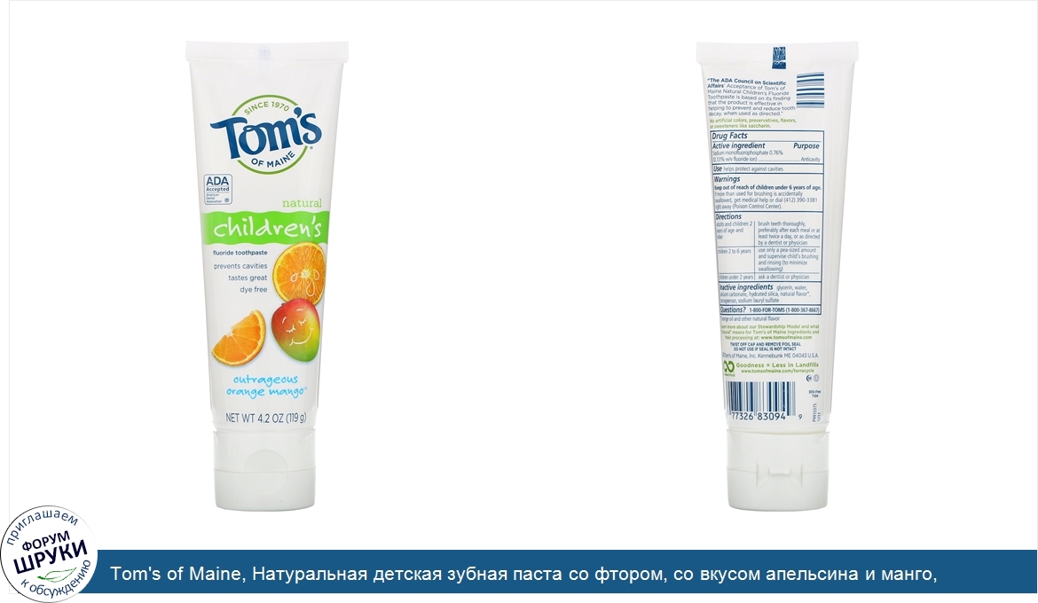 Друзья, если у вас есть отзыв/дополнение/комментарий/вопрос относительно Tom's of Maine, Натуральная детская зубная паста со фтором, со вкусом апельсина и манго, 119г (4,2унции) - напишите его ответом в эту тему (это будет полезно всему сообществу в целом и вам в отдельности).