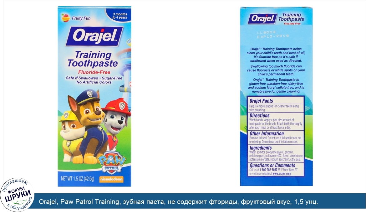 Друзья, если у вас есть отзыв/дополнение/комментарий/вопрос относительно Orajel, Paw Patrol Training, зубная паста, не содержит фториды, фруктовый вкус, 1,5 унц. (42,5 г) - напишите его ответом в эту тему (это будет полезно всему сообществу в целом и вам в отдельности).