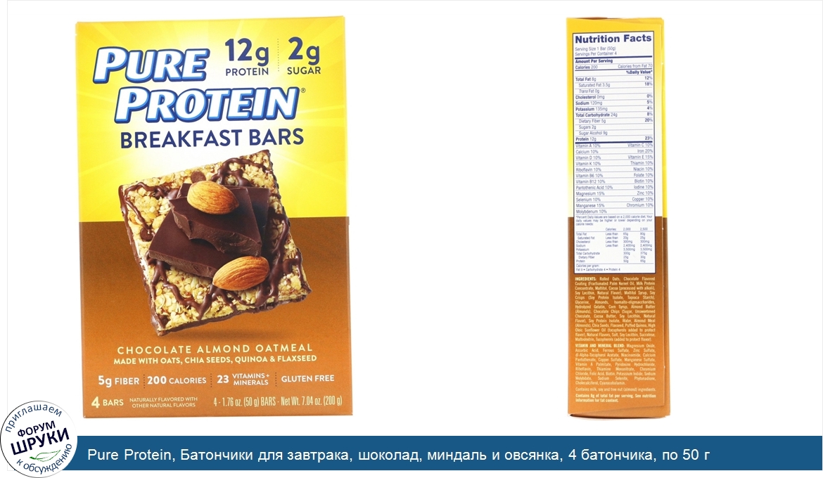 Друзья, если у вас есть отзыв/дополнение/комментарий/вопрос относительно Pure Protein, Батончики для завтрака, шоколад, миндаль и овсянка, 4 батончика, по 50 г каждый - напишите его ответом в эту тему (это будет полезно всему сообществу в целом и вам в отдельности).