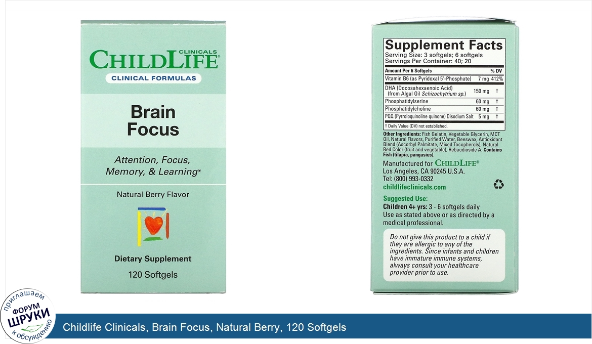 [DESCRIPT]Attention, Focus, Memory, Learning. Dietary Supplement. During childhood, the brain undergoes tremendous growth and maturation which lays the groundwork for healthy attention, focus, memory, and learning. ChildLife® Clinicals Brain Focus. delivers a precise blend of nutrients uniquely formulated to provide a solid foundation for supporting and maintaining the healthy development and optimal function of your child's brain and mind. ChildLife® Clinicals. uses only the highest quality ingredients. Gluten free, alcohol free, casein free. No artificial colors, flavors or sweeteners. ChildLife® Clinicals Brain Focus. has been formulated to provide your child with key brain support ingredients that promote the development of optimal focus, attention, and learning, all in a convenient chewable softgel. ChildLife® Clinicals Brain Focus. provides these key brain health ingredients per serving:. Vitamin B6: For healthy brain development. DHA: An omega-3 fatty acid, fundamental to healthy brain structure optimal function. PQQ: For neuroprotective support. Phosphatidylcholine: A major phospholipid in cell membranes supportive to cognitive performance. Phosphatidylserine: For enhanced attention support . ChildLife® Clinicals. is formulated by Dr. Murray Clarke, leading Holistic Pediatrician in the U.S.A. ChildLife® Clinicals. supplements provide the highest quality ingredients available, which are all natural, clean, pure, and fresh.[/DESCRIPT]... (описание дополняется)