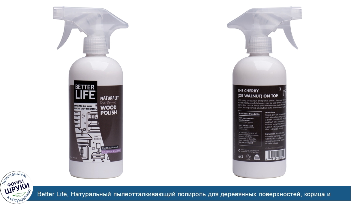 Друзья, если у вас есть отзыв/дополнение/комментарий/вопрос относительно Better Life, Натуральный пылеотталкивающий полироль для деревянных поверхностей, корица и лаванда, 16 унций (473 мл) - напишите его ответом в эту тему (это будет полезно всему сообществу в целом и вам в отдельности).