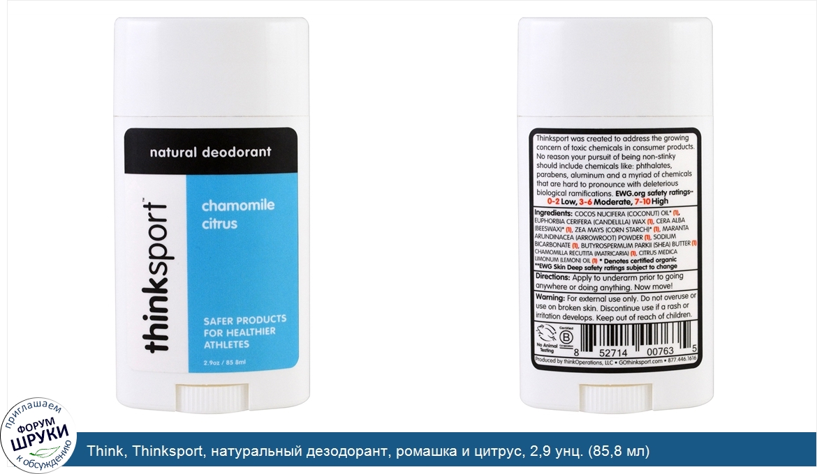 Друзья, если у вас есть отзыв/дополнение/комментарий/вопрос относительно Think, Thinksport, натуральный дезодорант, ромашка и цитрус, 2,9 унц. (85,8 мл) - напишите его ответом в эту тему (это будет полезно всему сообществу в целом и вам в отдельности).