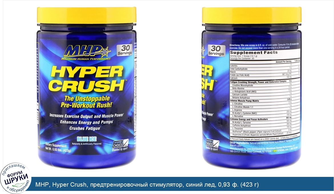 Друзья, если у вас есть отзыв/дополнение/комментарий/вопрос относительно MHP, Hyper Crush, предтренировочный стимулятор, синий лед, 0,93 ф. (423 г) - напишите его ответом в эту тему (это будет полезно всему сообществу в целом и вам в отдельности).