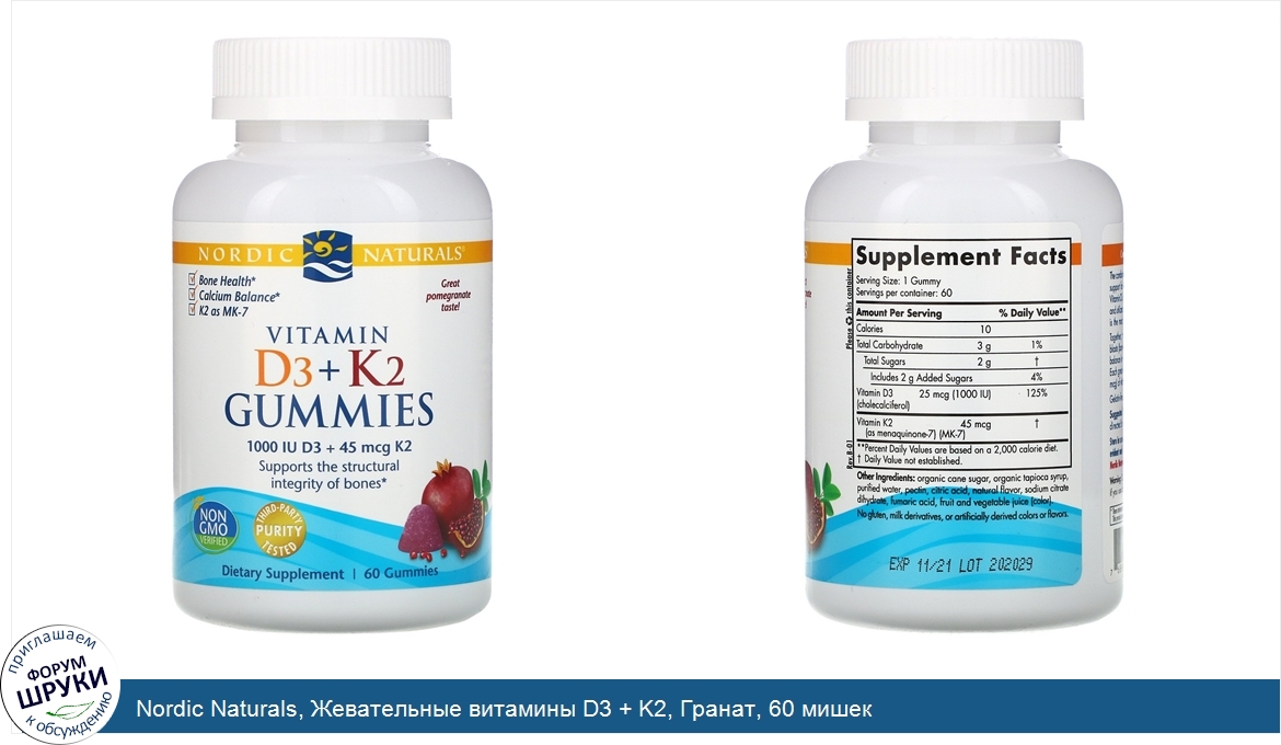 Здоровье костей. Баланс кальция. K2 в виде MK-7. Отличный вкус граната! . 1000 МЕ D3 + 45 МКГ K2. Укрепляет структурную целостность костей. Продукт проверен на отсутствие ГМО. Чистота продукта проверена в независ...