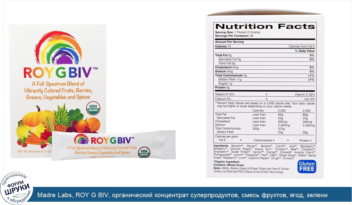 Друзья, если у вас есть отзыв/дополнение/комментарий/вопрос относительно Madre Labs, ROY G BIV, органический концентрат суперпродуктов, смесь фруктов, ягод, зелени, овощей, специй, 30 пакетиков по 3 г каждый - напишите его ответом в эту тему (это будет полезно всему сообществу в целом и вам в отдельности).