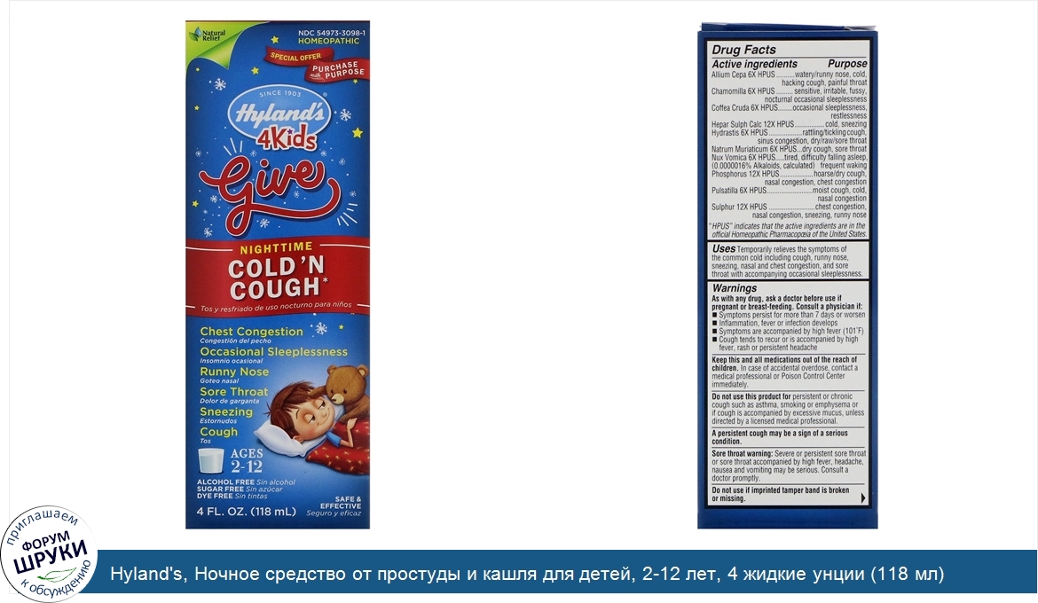 Друзья, если у вас есть отзыв/дополнение/комментарий/вопрос относительно Hyland's, Ночное средство от простуды и кашля для детей, 2-12 лет, 4 жидкие унции (118 мл) - напишите его ответом в эту тему (это будет полезно всему сообществу в целом и вам в отдельности).