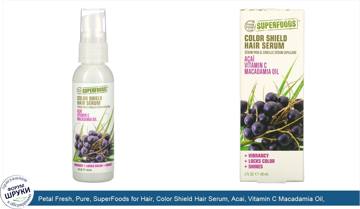 [DESCRIPT]Vibrancy + Locks Color + Shines. Vegan. Gluten-Free. Color Safe. Sustainable. Cruelty-Free. Our Story. Rooted in Southern California, Petal Fresh Pure is a natural lifestyle brand on a mission to share the benefits of clean and healthy living. We've harnessed the power of nature's freshest plant-based ingredients and packaged that goodness into every product we make. Superfoods For Vibrant Hair Acai + Vitamin C + Macadamia Oil . Don't let your color fade away. Add a nutrient-rich Superfood Ingredient, Vitamin Supplement and a proven natural remedy to your haircare regimen with this potent leave-in serum. Our Color Shield formula blends the power of Acai, Vitamin C and Macadamia Oil to lock in color and enhance vibrancy while hydrating damaged, dry hair. SuperFoods delivers all of the essentials to maintain gorgeous, color-treated hair - let yourself shine.[/DESCRIPT]... (описание дополняется)