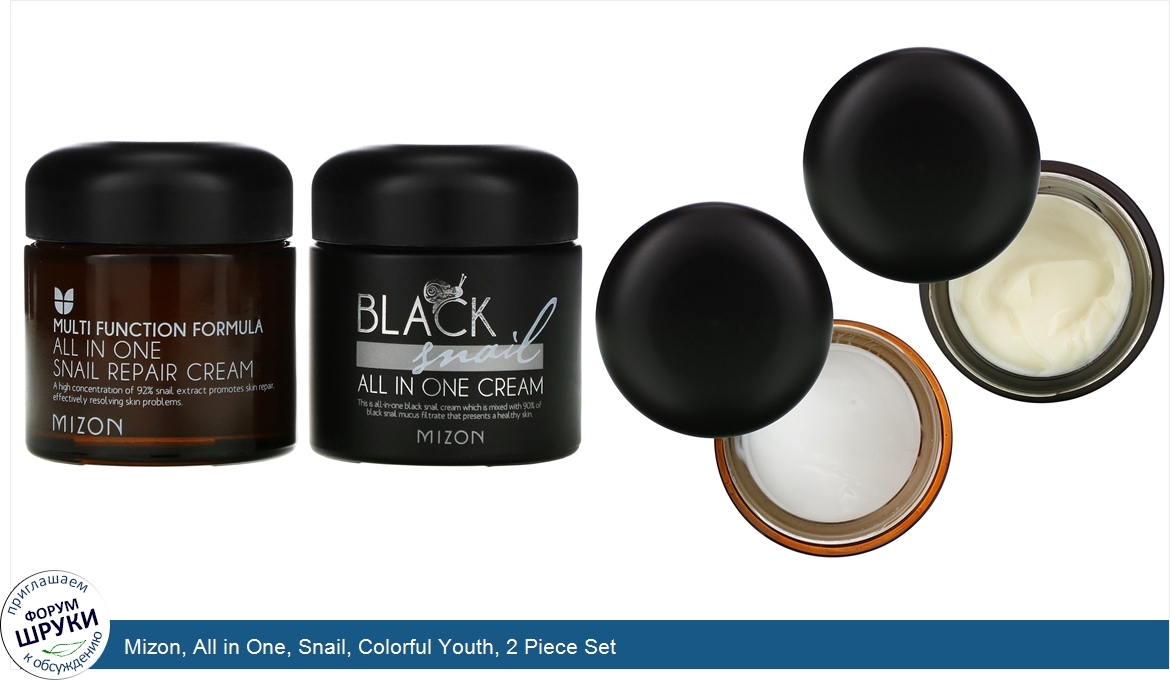 Set Contains. Mizon. All in One Snail Repair Cream. (75 ml). Mizon. Black Snail All in One Cream. (75 ml). [All In One Snail Repair Cream]. 92% snail slime mucin. [Purpose]. Anti wrinkle. [Uses]. This original sn...