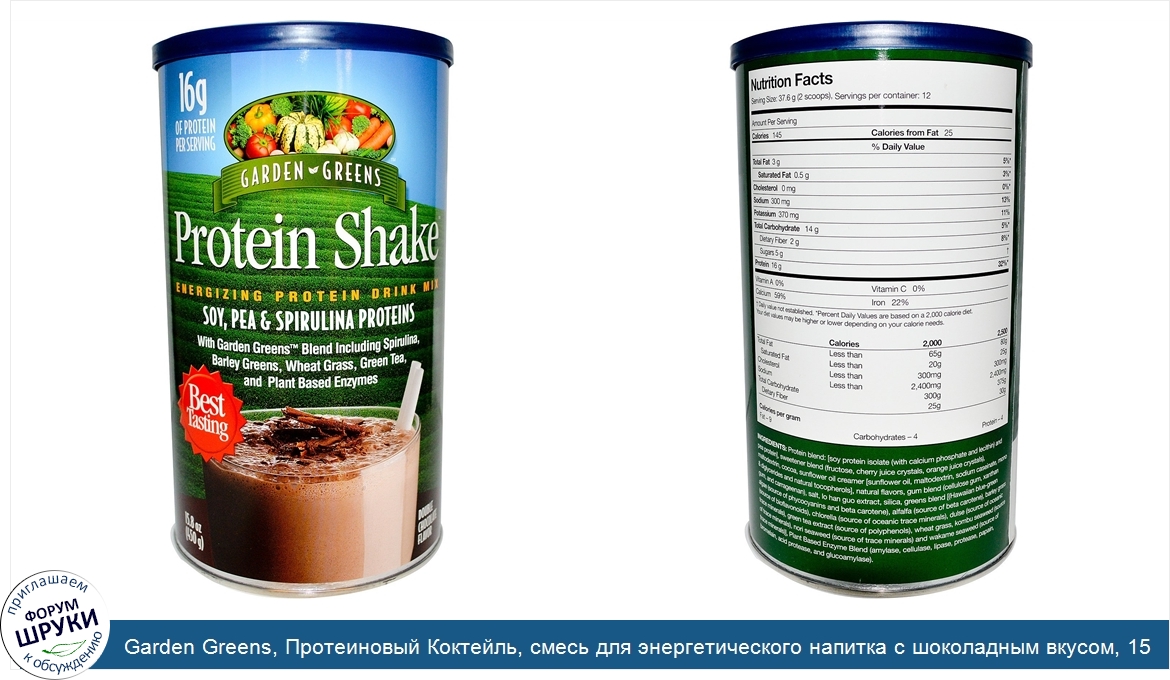 16 г белка в одной порции. протеины сои, гороха и спирулины. Содержит фирменную смесь травяных ингредиентов от Garden Greens, в том числе, спирулину, ростки ячменя и пшеницы, зеленый чай и растительные ферменты. ...