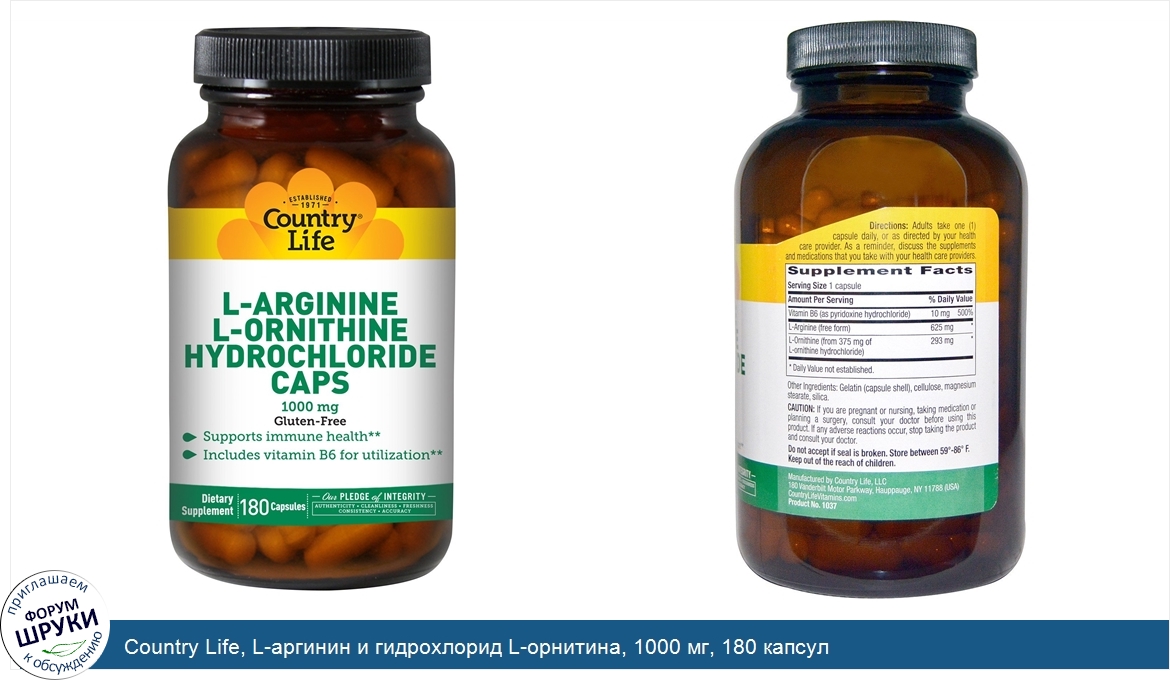 Country Life, L-аргинин и гидрохлорид L-орнитина, 1000 мг, 180 капсул