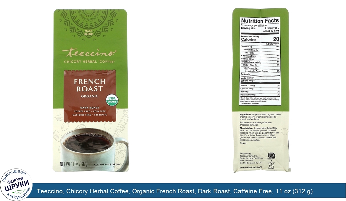 [DESCRIPT]Maya Blend. Chicory Herbal 'Coffee'. Coffee Free. Acid Free. Prebiotic. USDA Organic. All Purpose Grind. Kosher Parve. Certified Organic by QAI. Vegan. Rich. Bold. Satisfying. Intense deep coffee notes from roasted ramón seeds and chicory roots create a robust, focused body without any sweetness. Enjoy Teeccino's deliciously rich, deep-roasted flavor that delivers all the satisfaction without the caffeine and acidly of coffee! Discover why Teeccino fans describe it as smoother, richer, and creamier than coffee. The secret? French chicory, the roasted root often added to coffee, blended with barley, Italy's favorite caffeine-free roasted brew, and Spanish carob, famed for its chocolaty flavor. Enriched with ramón seeds, a traditional Mayan roasted beverage, a cup of Teeccino brims with many health benefits:. 100% naturally caffeine free—better than decaf. Acid Free—helps restore alkaline balance. Natural energy boost—from nutrients, not stimulants. Heart-healthy potassium—for optimal performance. Prebiotic - A prebiotic soluble fiber that feeds your gut flora to improve digestion, elimination, and support the immune system. Enjoy Teeccino Many Ways. Hot. Low Calorie Dessert. Energizing Smoothie Base. Iced. Beyond Fair Trade: Creating New Trade! Most of Teeccino's ingredients are grown in Europe and the USA. We pioneer new trade for organic chicory with smallholder farmers in India and for wild harvested ramón seeds with rainforest villagers in Central America. These ingredients create economic opportunities where income is scarce. By drinking Teeccino, you join us in supporting families devoted to organic, fair trade values in both developed and emerging countries.[/DESCRIPT]... (описание дополняется)