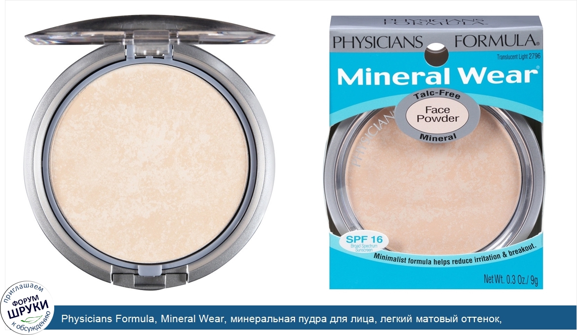 Physicians Formula, Mineral Wear, минеральная пудра для лица, легкий матовый оттенок, солнцезащитное средство широкого спектра с SPF 16, 0,3 унции (9 г)