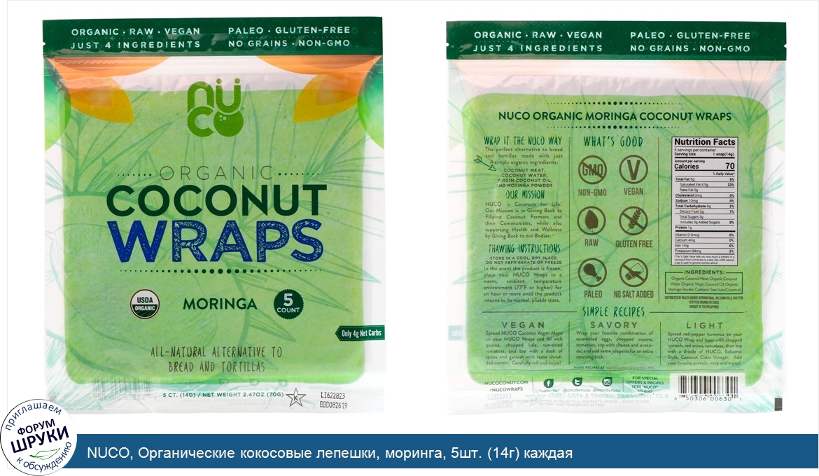 [DESCRIPT]Organic. Raw. Vegan. Just 4 Ingredients. Paleo. Gluten-Free. No Grains. Non-GMO. USDA Organic. Only 4g Net Carbs. All-Natural Alternative to Bread and Tortillas. Kosher. No Salt Added. Certified Organic by CERES. Wrap It The NUCO Way. The perfect alternative to bread and tortillas made with just 4 simple organic ingredients:. Coconut meat. Coconut water, virgin coconut oil, and Moringa powder. Our Mission. NUCO is coconuts for life! Our mission is giving back to Filipino coconut farmers and their communities, while also supporting health and wellness by giving back to our bodies.[/DESCRIPT]... (описание дополняется)