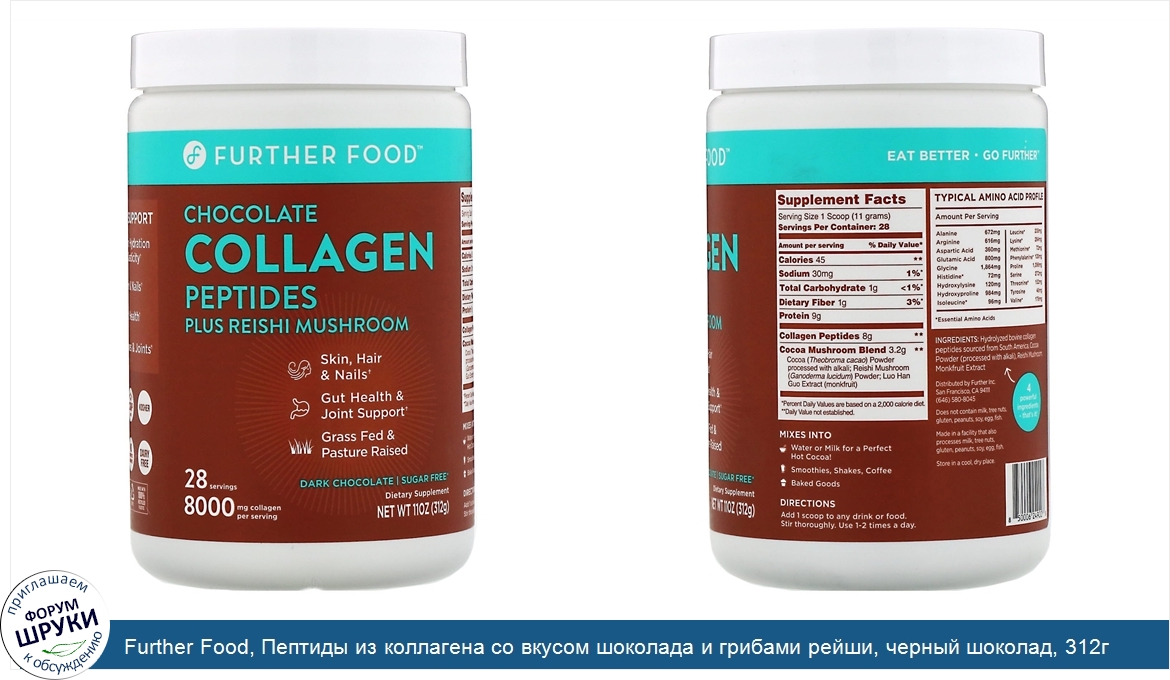 Друзья, если у вас есть отзыв/дополнение/комментарий/вопрос относительно Further Food, Пептиды из коллагена со вкусом шоколада и грибами рейши, черный шоколад, 312г (11унций) - напишите его ответом в эту тему (это будет полезно всему сообществу в целом и вам в отдельности).