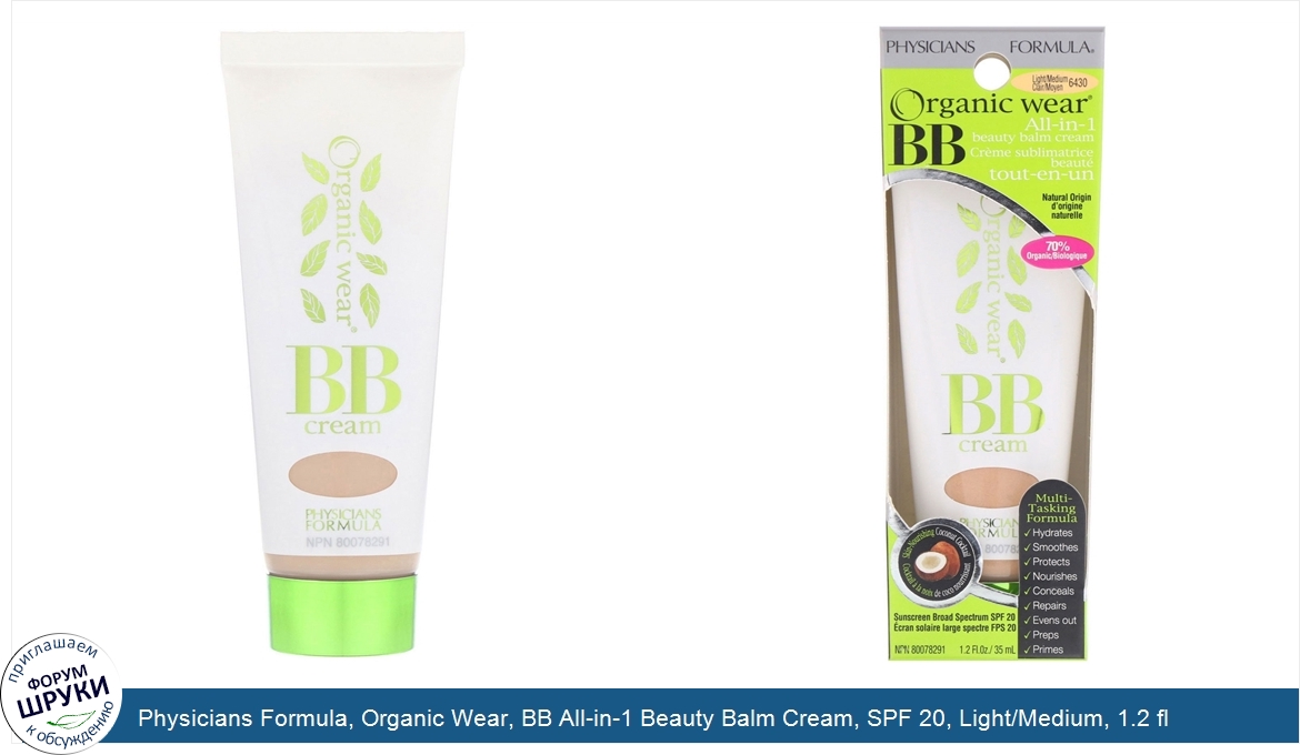 Physicians Formula, Organic Wear, BB All-in-1 Beauty Balm Cream, SPF 20, Light/Medium, 1.2 fl oz (35 ml)