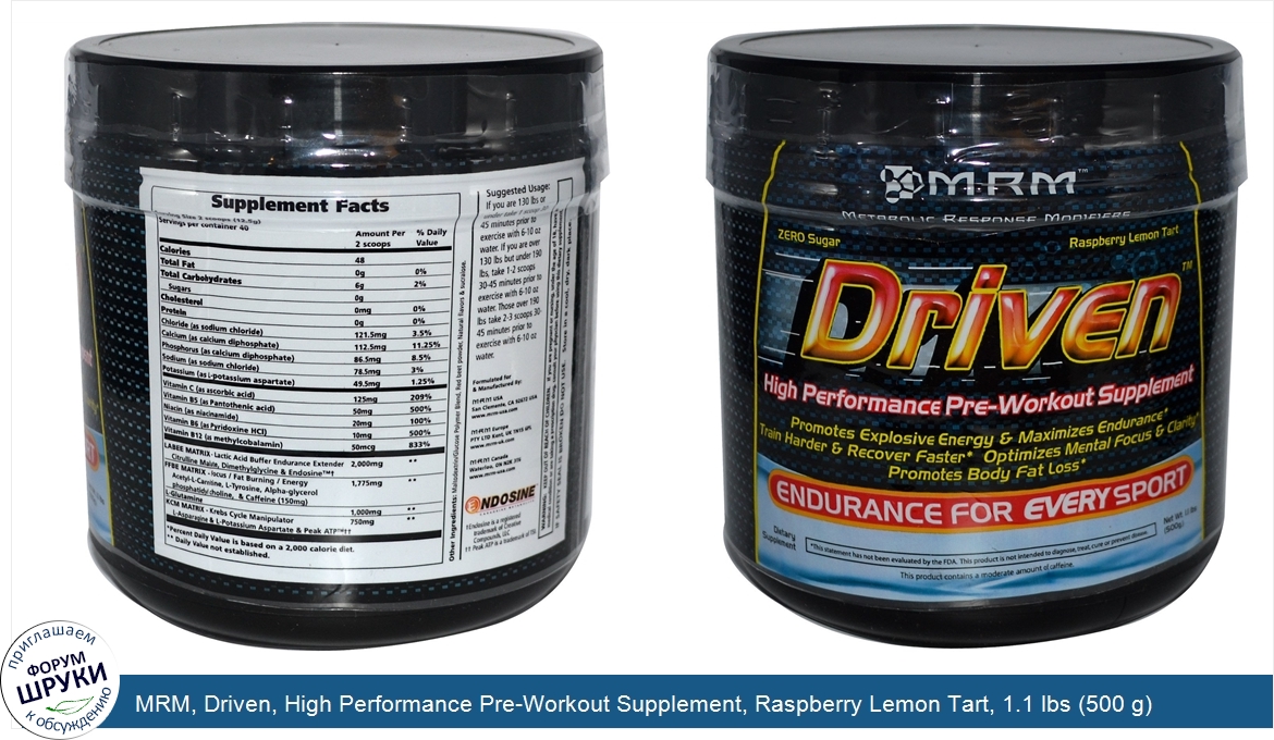MRM, Driven, High Performance Pre-Workout Supplement, Raspberry Lemon Tart, 1.1 lbs (500 g)